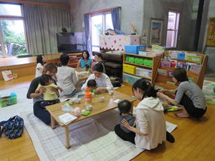 ゆうき山保育園では、マイ保育園登録していただいたご家庭を対象に、月に1回、身長体重測定や、お話会、親子あそびを楽しんだ後、ティータイムでおしゃべりをする時間を作る、「プーさんの会」を4月からつくりました。