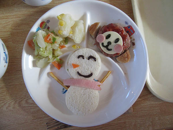 今月のメニューは、さる年にちなんで赤いほっぺのおさるさんとお友だちのゆきだるまさんです。