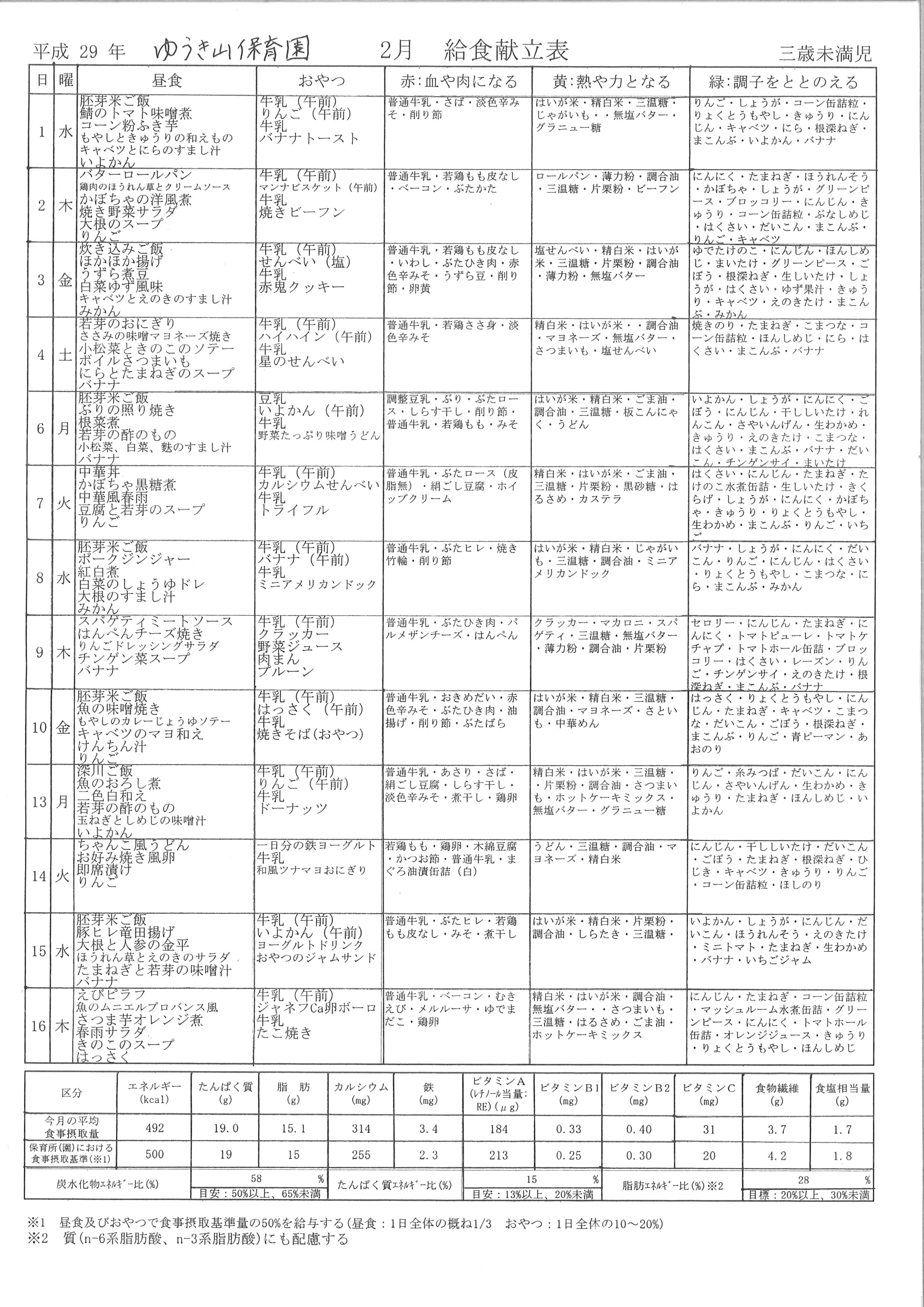 給食献立表(2月)<三歳未満児>