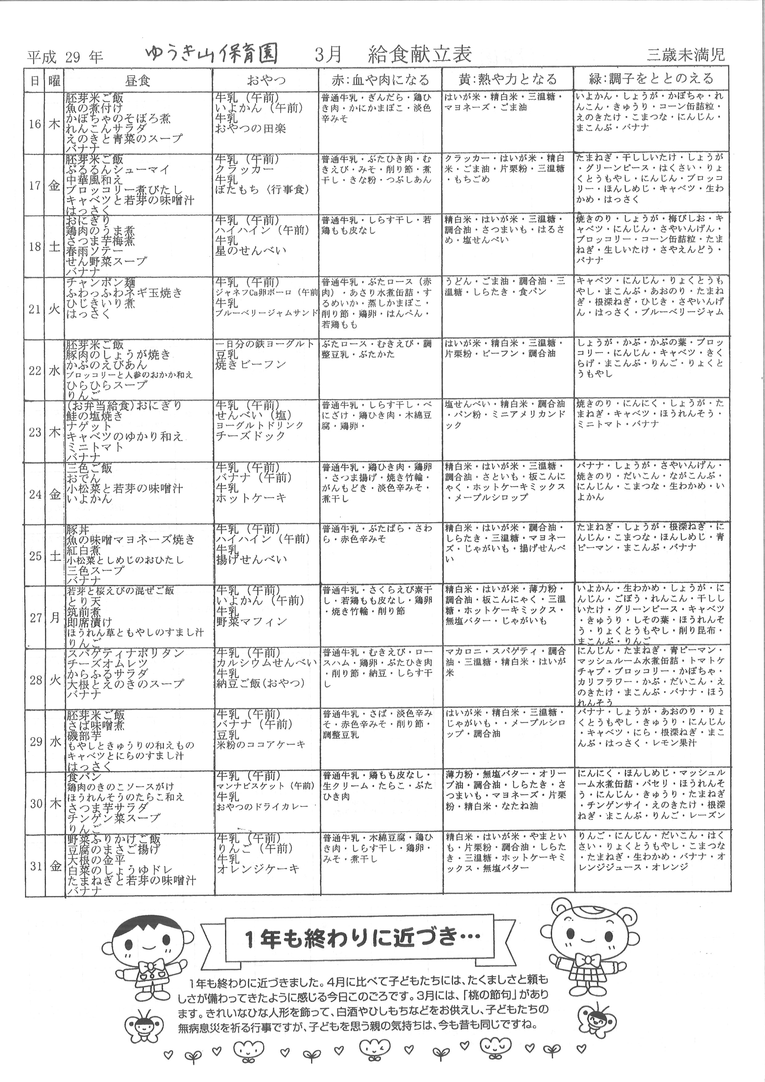 給食献立表(3月)<三歳未満児>