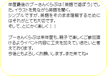 毎月のプーさんの会の日程については、プーさんクラブ年間行事予定表を確認してください。