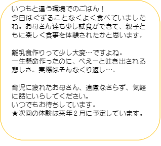 ベビーマッサージや離乳食体験など専門講師や園の栄養士による講座も行っています。