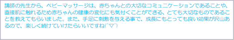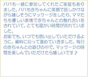 ベビーマッサージや離乳食体験など専門講師や園の栄養士による講座も行っています。